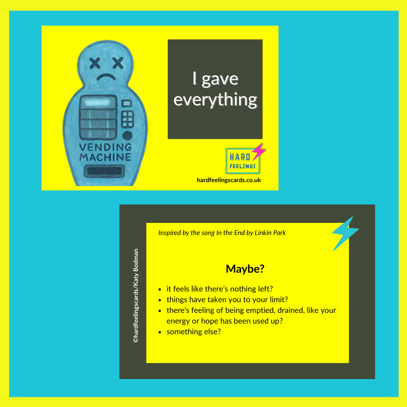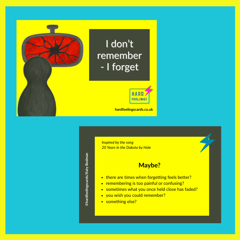 While they don’t use exact lyrics, each card draws from the feeling behind the music – those moments of feeling small, forgotten, angry, numb, or profoundly alone. They name what can feel unnameable: the weight of memory, the confusion of blame, the urge to forget, and the silence that sometimes follows it all.